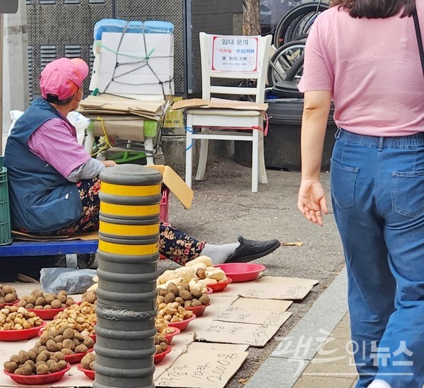 가맹점보다 차라리 일반 자영업과 월급쟁이가 낮겠지만, 상황은 별반 다르지 않다. 서울지하철 8호선 남한산성입구역 옆에 80대 노인이 감자와 생강 등을 파는 노점을 열었지만, 손님이 없다. 인근 자혜로 중부초등학교 앞에서 공공근로를 하는 노인도 최근 기온이 오르면서 힘들기는 마찬가지다. [사진=정수남 기자]