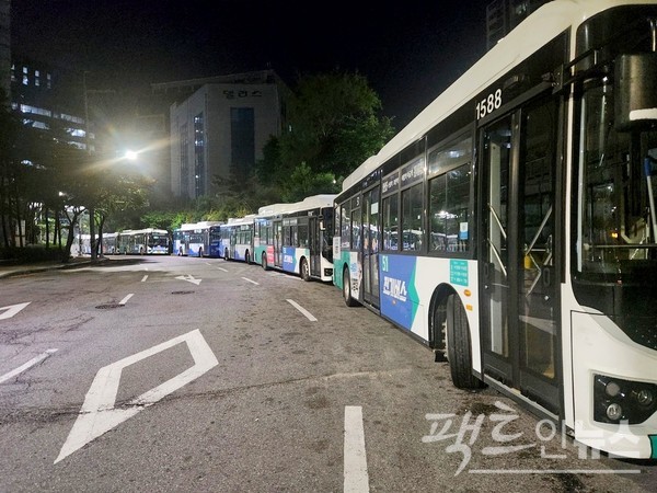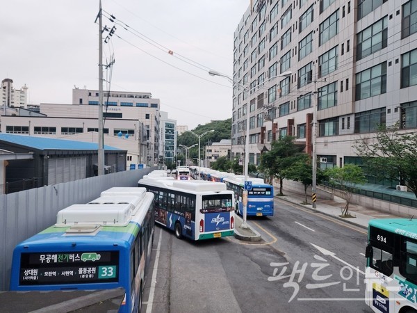 ​차고지에 경유 버스보다 전기 버스가 더 많다. [사진=정수남 기자]