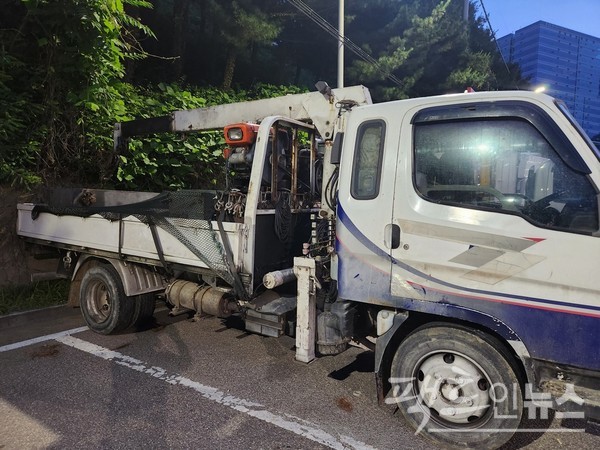 재미있는 장면을 최근 카메라에 담았다. 5톤 트럭을 개조해 크레인을 설치한 트럭이 경운기 엔진을 장착한 것이다.