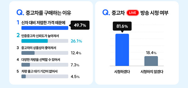 응답자 가운데 49.7%가 신차보다 가격이 저렴해서를 들었다. 이어 인증중고차 업체의 신뢰도가 높아져서(26.1%), 중고차의 상품성이 좋아졌기 때문에(12.4%), 다양한 선택지가 있어서(7.3%), 차량 출고 대기 기간이 없어서(4.5%) 등도 나왔다.