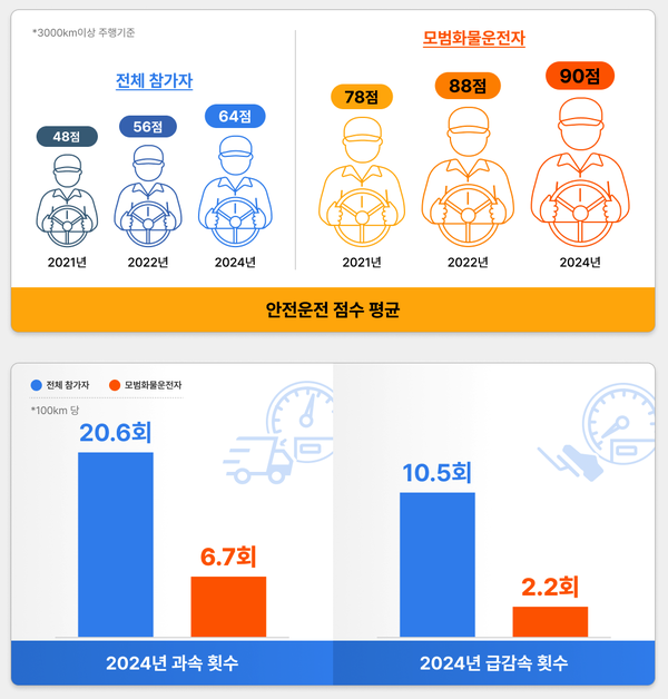 올해 대회에서 참여자 평균 점수가 64점, 모범화물운전자로 선발한 운전자의 평균 점수가 90점에 달했다.