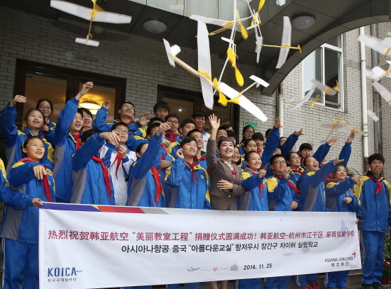 아시아나항공 문명영 중국지역 본부장은 25일(현지시각) 중국 저장성(浙江省) 항저우시 (杭州市) 장간구(江干区) 차이허(采荷)실험학교에서 상하이총영사관 구상찬 총영사, 위시화 (虞希华) 저장성 외사판주임, 허쯔잉(何志英) 학교장 등이 참석한 가운데 아름다운 교실 자매결연을 맺었다.