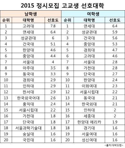 대학교육 전문 인터넷신문 대학닷컴은 15일 고교생 653명(남 206명, 여 447명)을 대상으로 ‘지원 여부와 상관없이 선호하는 대학 3곳’을 설문조사한 결과 남학생은 고려대(7.8%), 연세대(6.4%), 성균관대(6.0%), 건국대(5.1%), 한양대(4.6%)가 2~5위를 차지했다.