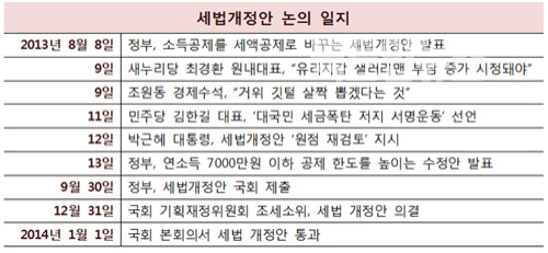 박근혜 정부는 20138~12월 기존 소득공제를 현재의 세액공제로 변경하는 내용을 담은 세법개정안을 국회에서 통과시켰다. 여야는 당초 서민·중산층 부담 증가를 우려해 반대했으나, 새누리당은 세수 확대를 위해 총대를 멨고 당시 민주당은 등 떠밀려 법안 통과에 동의했다.