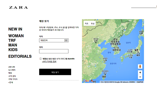 2일 <뉴스1>단독 보도에 따르면 자라코리아 공식홈페이지에서 자라 매장 찾기 메뉴에서 ‘일본해’를 우선 표기하는 지도를 사용하고 있다.