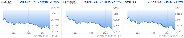 그간 뉴욕증시는 트럼프 대통령 당선 이후 미국보호무역주의, 대기업 감세를 포함한 세제개혁안, 금융 규제 완화 등의 기대감으로 견인돼왔다. 하지만 최근 트럼프 대통령의 러시아 내통·기밀유출 의혹, 제임스 코미 FBI(연방수사국) 국장 해임 사태 등으로 워싱턴 정계의 불확실성이 증폭되면서 투자자들의 투자심리를 위축시킨 것.