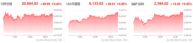 22일(현지시간) 뉴욕증권거래소(NYSE)와 주요 통신사에 따르면 다우존스30산업평균지수는 전장대비 0.43%(89.99p) 상승한 2만 894.83에 거래 종료했다. S&P(스탠다드앤드푸어스)500지수는 0.52%(12.29p) 오른 2394.02에, 기술주 중심의 나스닥지수는 0.82%(49.91p) 상승한 6133.62에 마감했다.