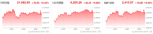 25일(현지시간) 뉴욕증권거래소(NYSE)와 주요 통신사에 따르면 다우존스30산업평균지수는 전장대비 0.34%(70.53p) 상승한 2만 1082에, S&P(스탠다드앤드푸어스)500지수는 0.44%(10.68p) 뛴 2415.07에 거래 종료했다. 나스닥종합지수는 0.69%(42.23p) 오른 6205.26을 기록했다.