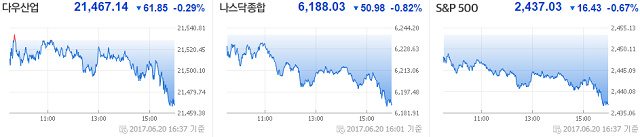 전날 사상 최고치를 마감을 이끌었던 나스닥과 S&P 지수도 이날은 맥을 못 춘 모습이다. S&P(스탠다드앤드푸어스)500지수는 전장대비 0.67%(2437.03p) 떨어진 2437.03에, 기술주중심의 나스닥종합지수는 0.82%(50.98p) 내린 6188.03에 장을 마감했다.