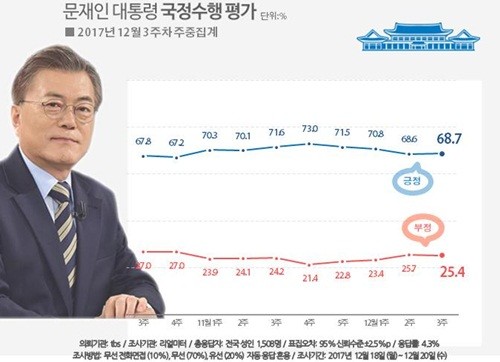 문재인 대통령 국정수행 지지도가 지난주 주간집계 대비 0.1%p 오른 68.7%(매우 잘함 47.1%, 잘하는 편 25.4%)로 최근 3주 동안 이어졌던 하락세가 멈추고 지난주의 지지율을 유지한 것으로 나타났다.