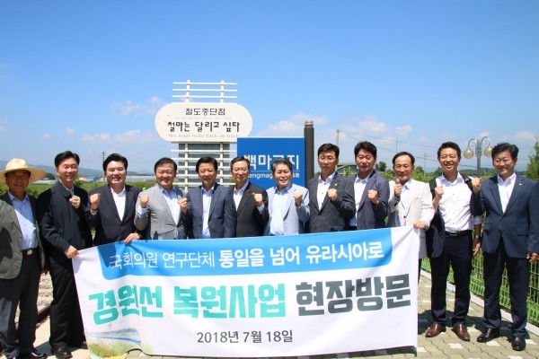 더불어민주당 노웅래 의원과 자유한국당 홍문표 의원이 대표로 있는 국회의원 연구단체 ‘통일을 넘어 유라시아로(국회 철도·통일·경제 포럼)’는 18일 다가오는 통일시대와 동북아 물류중심시대를 맞아 접경지역 개발 가속화 및 철도운송 기반 확대 방안 검토를 위해 경원선 복원사업 현장을 방문했다.
