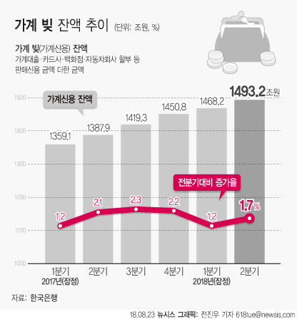 23일 한국은행이 발표한 ‘2018년 2분기 중 가계신용(잠정)’ 보고서에 따르면 6월 말 가계 신용(가계부채+판매신용)은 1493조2000억원이었다.