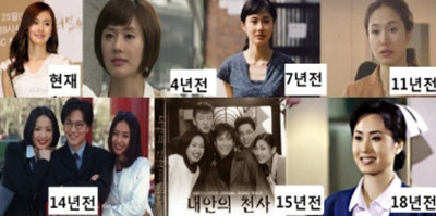 특히 작품별로 김지수의 사진을 비교한 것을 보면 ‘뱀파이어녀', '방부제녀'라는 단어가 실감난다. 오히려 요즘 유행과 맞지 않는 화장법 때문에 현재의 김지수가 젊어 보인다.