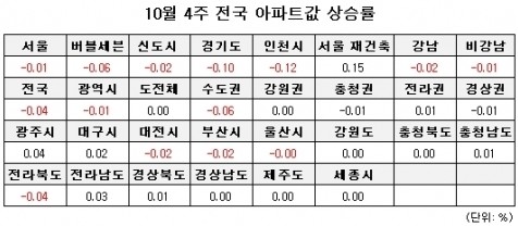부동산뱅크 조사에 따르면 전국아파트값은 -0.04%로 8주 연속 하락했다. 이어 서울 -0.01%, 수도권 -0.06%, 도지역 0.00%, 5대 광역시 -0.01% 등을 기록했다.