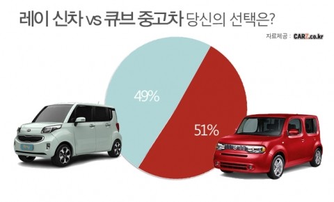 중고차 전문업체 카즈가 홈페이지 방문자 411명을 대상으로 ‘레이 신차 vs 큐브 중고차’ 선호도를 조사한 결과 “중고차라도 큐브를 선택하겠다”는 응답이 51%를 차지했다. 수입 박스카의 원조 이미지와 경제적인 국산 박스카 중 소비자는 이미지를 선택한 것이다. 여기에 비록 중고차지만 경차가격으로 수입차를 탈 수 있다는 심리적 만족감도 더해진 것으로 보인다.